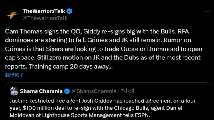 勇士自媒体@TheWarriorsTalk 转发了Shams的这一报道,并在旁边写道:“卡梅隆-托马斯签了资质报价,吉迪和公牛签下大合同。受限制自由球员市场的多米诺骨牌开始倒下了。格莱姆斯和库明加还在市场上。流言称76人希望交易德拉蒙德或者乌布雷为续约格莱姆斯腾出空间。截止最近的报道,库明加和勇士仍然没有动静。距离训练营开始还有20多天……”